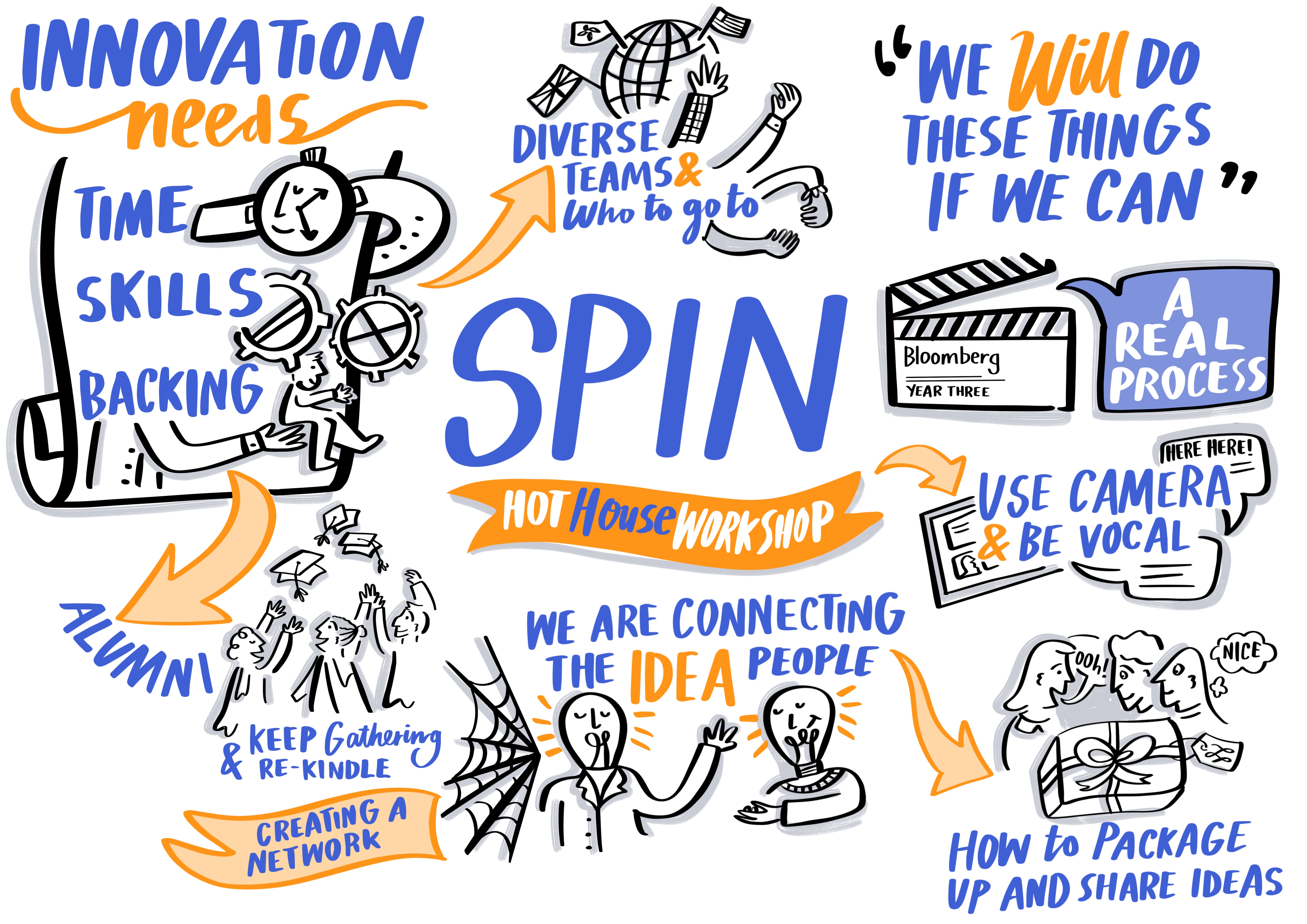Annie has worked for Bloomberg for several years, specifically at their Global innovation workshops, where she sits and takes in new ideas and helps to rapidly sketch them out. Here is a small selection of those sketches as well as guest speaker notes.