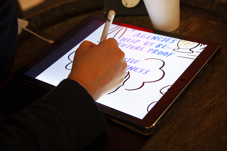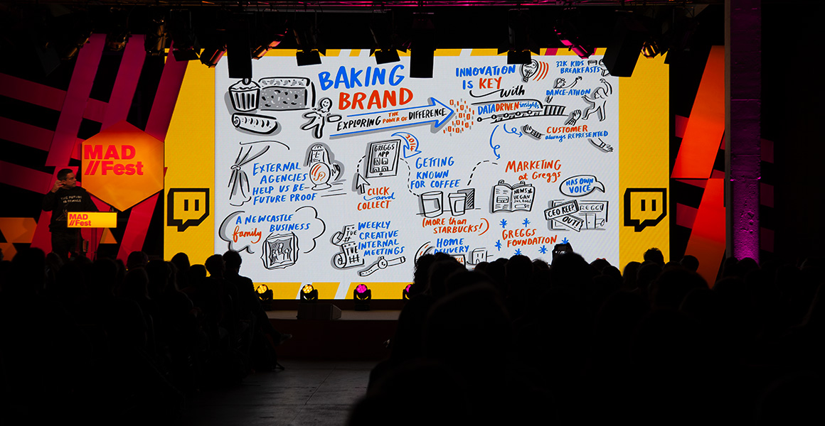 Live illustration at MAD//fest (Marketing, Advertising and Design) in London. Drawings were displayed on the auditorium screen in front of a 300 person event at the end of each guest speakers talk.